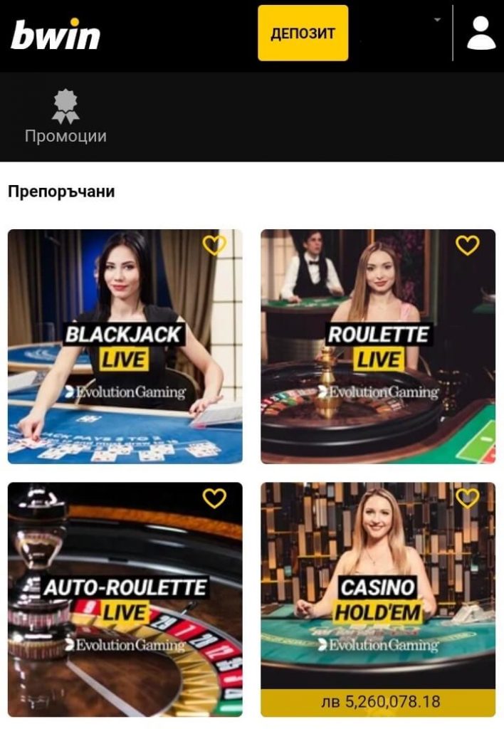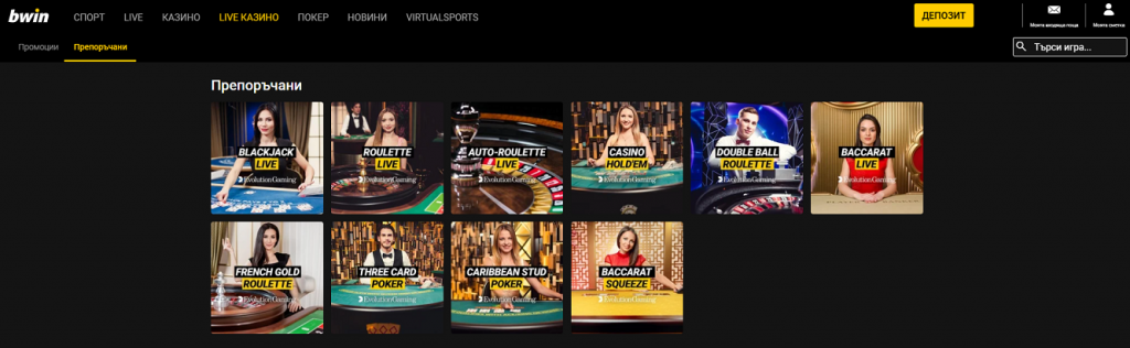 С кликването му се отварят „Промоции” и „Препоръчани”, като втората се зарежда по подразбиране само при десктоп версията на bwin.com). Едното отново пренасочва към „Златна скреч карта”, а другото – към всички налични маси за живи игри на рулетка, блекджек, бакара и покер.