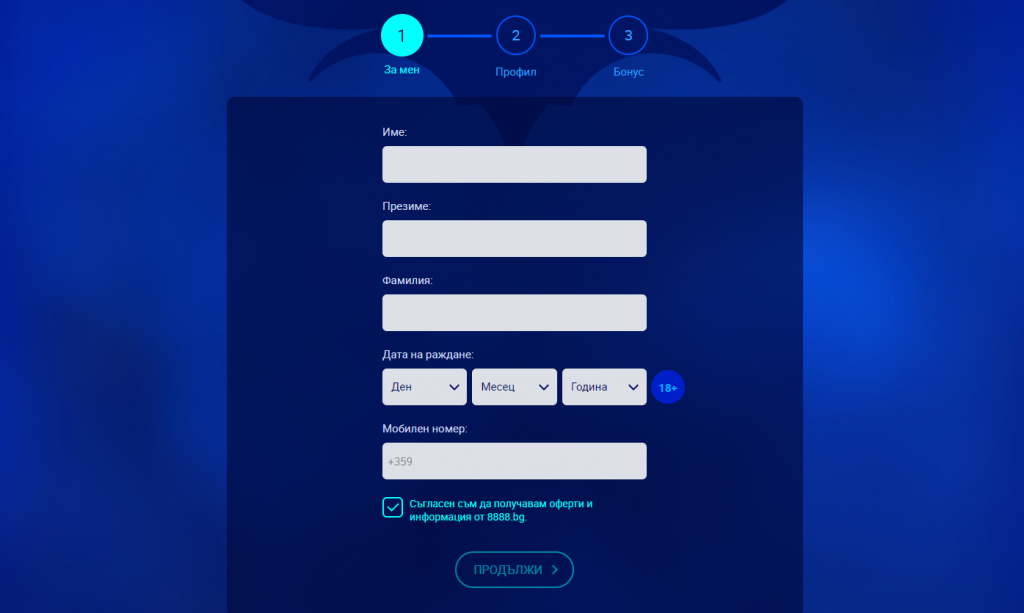 Първите полета, които ще видите пред себе си касаят вашите име, презиме и фамилия, а още дата на раждане, както и актуалният ви мобилен телефон. Най-долу на екраните ви ще откриете отметка, даваща право на букмейкъра да ви праща оферти и допълнителна информация. Натиснете, ако желаете да получавате такива.