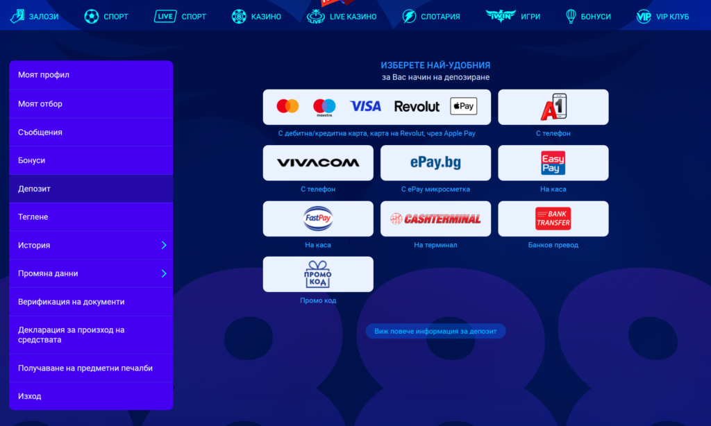 След като завършиш успешно създаването на акаунт в четири осмици и имаш достъп до всичко, което 8888 предлага на своите клиенти, то можеш да започнеш да залагаш на спорт или казино. Последната стъпка, която трябва да изпълниш е депозирането на средства. Разплащателните методи в 8888.bg са напълно достатъчни, за да успееш лесно и безпроблемно да инвестираш средства. Налични са най-популярните методи за депозит в България – дебитна/кредитна карта; EasyPay; FastPay; Cashterminal; Epay.bg; банков превод и т.н.