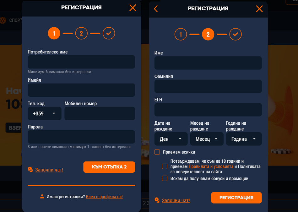 Личните данни ще бъдат изискани във втората стъпка. Име, Фамилия и ЕГН са достатъчни, за да получите достъп. Преди да завършите регистрацията, потвърдете, че сте пълнолетен, както и декларирайте, че се съгласявате с Правилата и условията на сайта.