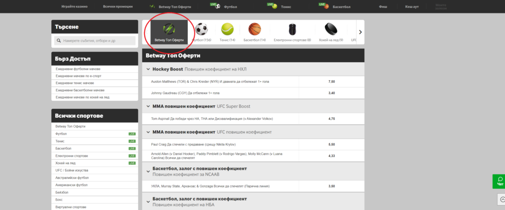 Изберете линка “Спортове” от главната навигация и веднага ще се появи списък с топ оферти за деня. Голяма част от маркетите с подобрени ставки са насочени към футбола, но не липсват и специални предложения за залагащи на тенис, голф, американски футбол, баскетбол и т.н.