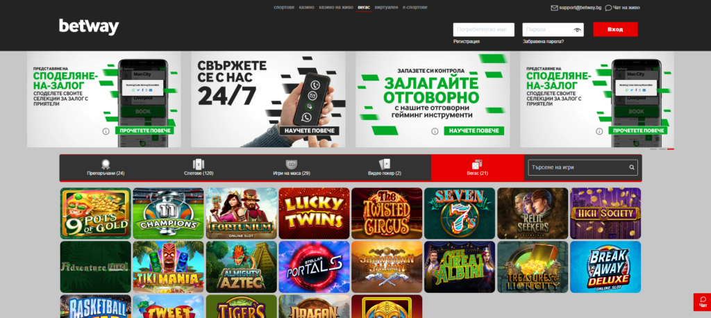 В началната страница на раздела на Betway България ще откриете именно това, което сте търсили. Цялостният казино Betway раздел се разделя на три части, съставящи подменю в главната навигационна схема на сайта. Освен стандартните казино и казино на живо, в сайта на Betway casino bg ще открием бонус раздел „Вегас“. Там се крият най-атрактивните продукти от портфолиото на казино игри betway.