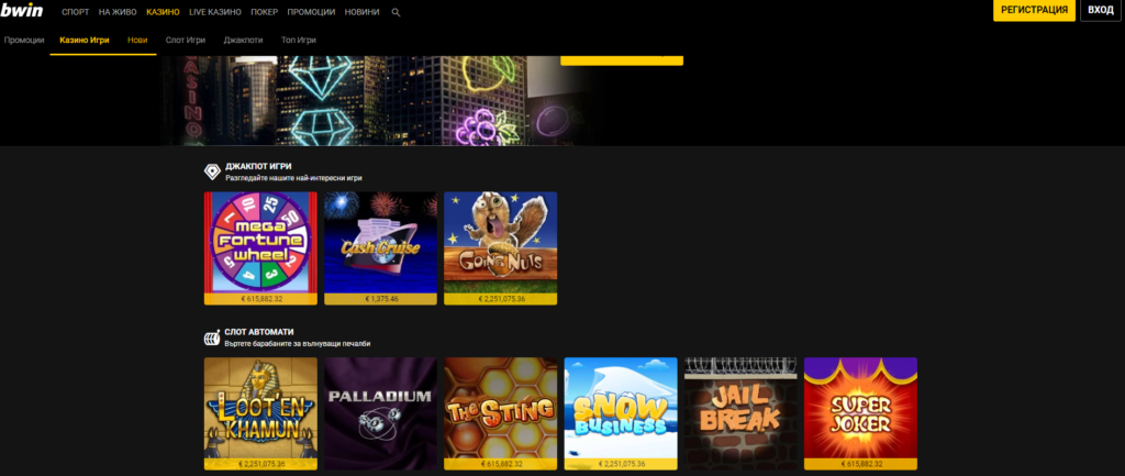 Игралните раздели в Bwin България пък са примамващи най-напред с няколкото си джакпот игри с динамично изменящи се парични награди, някои от които седемцифрени, като най-изкусителното за момента предложение може да донесе на „ударилия” го над 2.4 млн. евро.