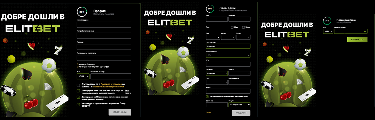 Ако искате да създадете нова регистрация в елитбет през телефон, последвайте същите стъпки. Благодарение на Elit bet Mobile App формулярът отново отнема само няколко минути.