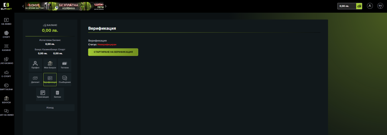 За да верифицирате своята регистрация в elitbet.bg е нужно влезете в профила си и да изберете от менюто „Верификация“. За новите регистрации ще видите като статус „Неверифициран“. Изберете бутона „Стартиране на верификация“, за да започнете.