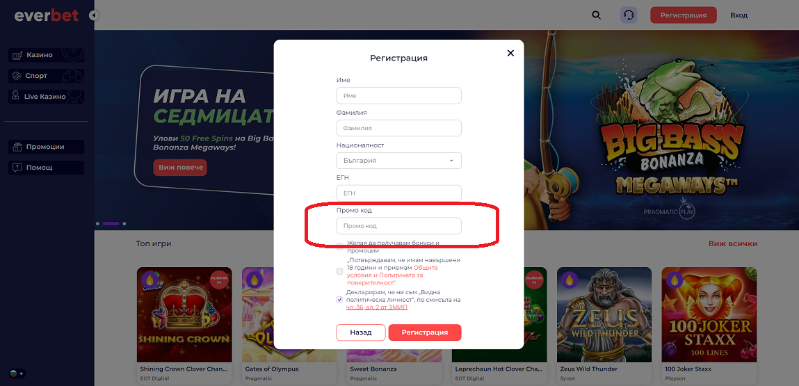 - При евърбет регистрация се попълват личните си данни: Имена; Националност; ЕГН и промо код.