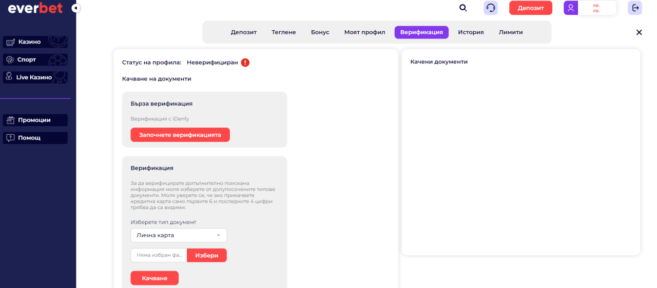 Неопитните играчи обаче, може би не знаят, че е нужно да верифицират акаунта си, за да могат да изтеглят натрупаните средства в тяхната банка. С неверифициран профил може да извършите депозит в everbet.bg, но не и да заявите теглене. Тук е мястото да отбележим, че това е стандартна практика във всички онлайн сайтове за залози и казина. Ето защо ви препоръчваме веднага след като завършите своята регистрация в EVERBET 2026 г., да потвърдите акаунта си. Може да верифицирате акаунта си през компютър/лаптоп или мобилно устройство.