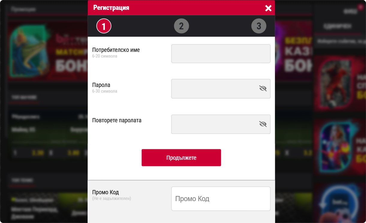 Формулярът за bet.bg регистрация е разделен в три стъпки, като в първата е нужно да зададете вашите входни данни – да изберете потребителско име и парола за вход. След това във втора стъпка трябва да добавите имейл и телефон за контакт с вас – друг задължителни данни за профила.
