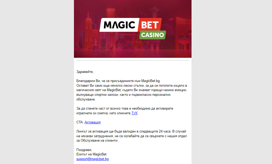 След завършване на процеса по magic bet регистрация новият клиент на компанията ще получи специален мейл на посочената от него (нея) електронна поща. Там ще бъде приветстват от екипа на оператора, като може да активира своя акаунт, за да може вече след това при въвеждане на потребителско име и парола да извършва депозити, да прави залози и да се възползва от бонусите на букмейкъра.