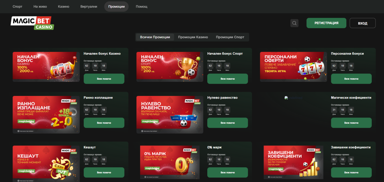 Има няколко основни причини да си направите меджик бет регистрация. Ако обичате спортните прогнози, то букмейкърът предоставя богато разнообразие в това отношение. При това не говорим само за менюто при футбола, но и за наличието на още 30 спорта в менюто на оператора. Раздел Спорт на сайта предлага широка гама от спортни събития и пазари за залагане. Един от основните акценти в Magic Bet е наличието на уникални промо оферти „Магически коефициенти“, които ви позволяват да залагате на специални завишени коефициенти за избрани събития. Освен това, платформата предлага популярния бонус Ранно изплащане, което дава възможност за по-ранно получаване на печалби, дори преди края на съответното спортно събитие. С редовни промоции за нови и активни играчи, Magic Bet продължава да бъде предпочитан избор за тези, които търсят повече шансове за печалби.