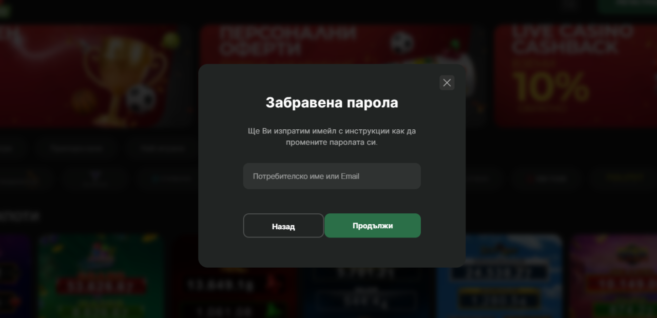 Ако не можете да се сетите за тайната комбинация, можете лесно да възстановите достъпа си до платформата за залози. Натискате бутона Вход горе вдясно и след това давате клик на Забравена парола. След това ще трябва да въведете електронната поща, която сте дали при регистрация в Magicbet. Можете да посочите и потребителското си име, но имейлът е по-важен.