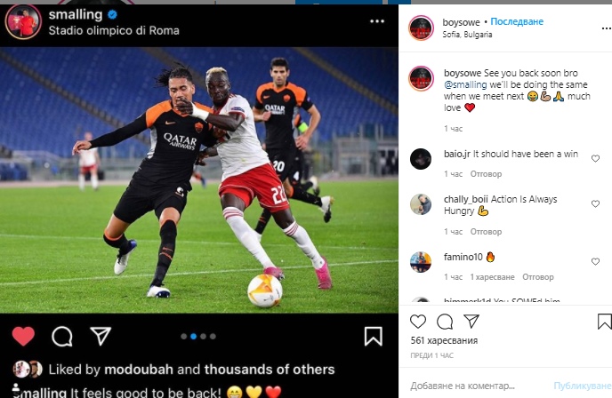 Смолинг написа: „Стархотно е чувството, че се завръщам”. Али Соу пък бързо намери снимката на бранителя на Рома и сподели същия кадър, като написа интересно послание към бившия играч на Ман Юнайтед