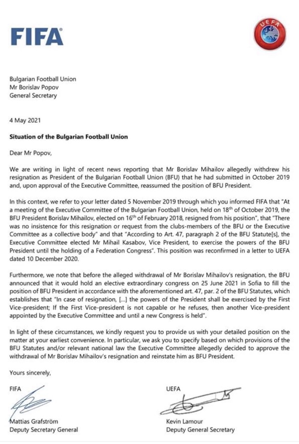 В този контекст се позоваваме на Вашето писмо от 5 ноември 2019 година, чрез което информирате ФИФА, че „На заседание на Изпълнителния комитет на Българския футболен съюз, проведено на 18 октомври 2019 г., президентът на БФС Борислав Михайлов, избран на 16 февруари 2018 г., подаде оставка от длъжността си“, че „Не е настоявано за тази оставка или не е поискана от клубовете-членове на БФС или Изпълнителния комитет като колективен орган“ и че „Съгласно чл. 47, ал. 2 от Устава (ите) на БФС, Изпълнителният комитет избра г-н Михаил Касабов, вицепрезидент, да упражнява правомощията на президент на БФС до провеждането на Конгрес на федерацията“. Тази позиция беше потвърдена в писмо до УЕФА от 10 декември 2020 година.