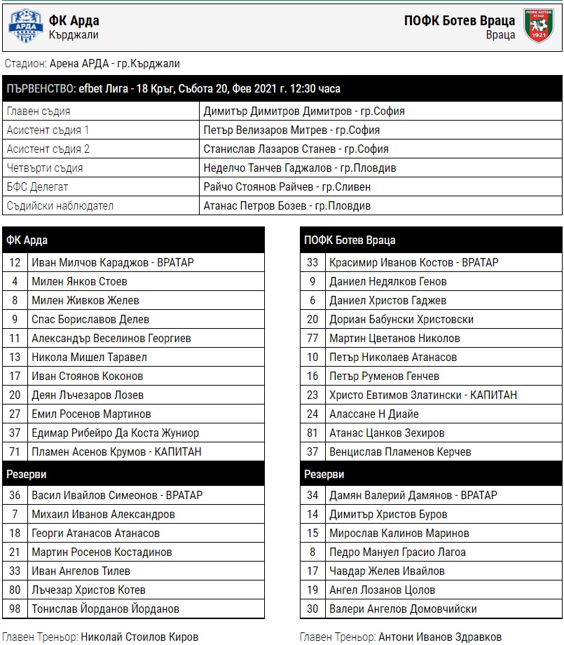 Ботев Враца: 33. Красимир Костов, 9. Даниел Генов, 6. Даниел Гаджев, 20. Дориан Бабунски, 77. Мартин Николов, 10. Петър Атанасов, 16. Петър Генчев, 23. Христо Златински-кап, 24. Алассане Н’Диайе, 81. Атанас Зехиров, 37. Венцислав Керчев
