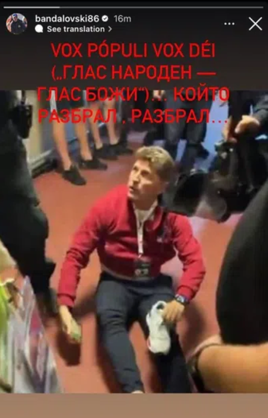По-малко от 24 часа след публикуваната снимка на Семерджиев и Бандаловски, бившият десен бек на Партизан сподели снимка на Стоилов от миналата година и момента, в който мениджърът бе съборен в коридорите на „Българска армия“, като написа: „Vox pópuli vox Déi („Глас народен — глас божи“)… Който разбрал , разбрал… ”