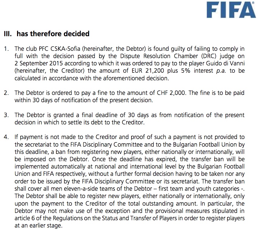 След оповестяването на решението по делото, ЦСКА има срок от 30 дни, в който може да изплати дълга и наложената глоба или да обжалва пред КАС. Ако глобата не бъде платена, ФИФА ще принуди БФС да наложи забрана на ЦСКА за регистрирането на нови играчи. Ако родната централа откаже да наложи наказанието, ФИФА може да извади страната от всички турнири, който се организират под егидата на световната футболна федерация.