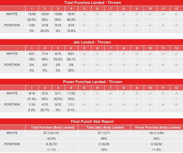 Боксовите анализатори коментират, че подобна ниска ефективност на ударите е много рядко срещана в боеве на такова ниво. За сравнение успеваемостта на Уайт е несравнимо по-висока – 43%, като британецът е успял да удари Поветкин впечатляващите 57 пъти.