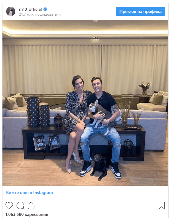 Халфът на Арсенал Месут Йозил се хвали със своите две кучета. Не знаем само това, което е останало извън прегръдката дали няма да се разсърди. Но явно не е много докачливо.
