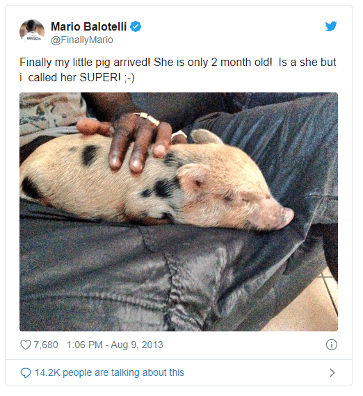 Струва да припомним, че през 2013 г. италианецът Марио Балотели си взе прасе джудженце. Не знаем обаче какво стана с него, в момента Марио има куче.