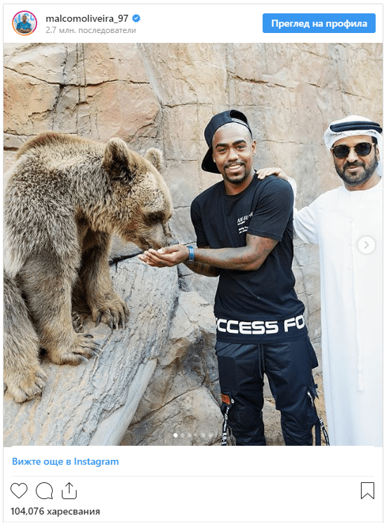 Малком Филипе Силва де Оливейра не отглежда мечка в дома си, но не крие предпочитанията си към по-големите хищници. На фотото бразилският полузащитник е увековечил посещението си в зоопарка, където позира заедно с дружелюбен мечок.