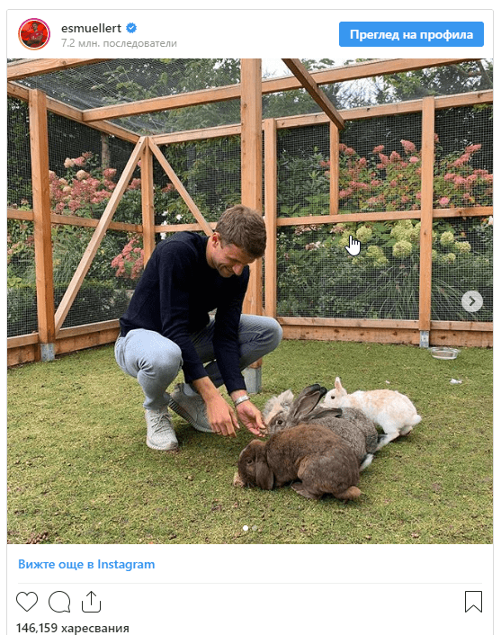 Нападателят на Байерн Томас Мюлер е събрал доста домашни любимци – той си има зайци, куче и кон. Всички те изглеждат страхотно, а и помагат на стопанина си да релаксира в приятна компания.
