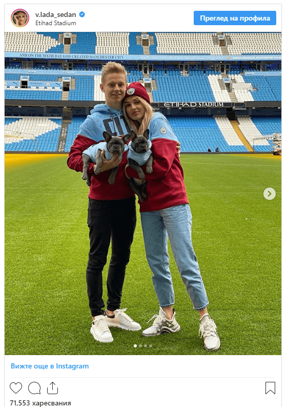 Колкото титли във Висшата лига, толкова и кучета! Играчът на Манчестър Сити Александър Зинченко позира със своите два сладура, облечени в сини костюмчета.
