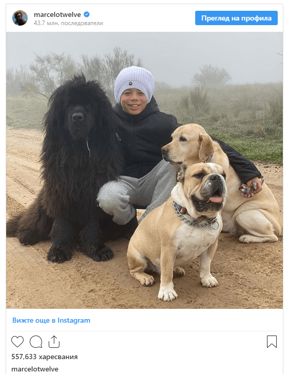 Синът на защитника на Реал Мадрид Марсело позира с трите им кучета. Всички са различни и ужасно симпатични.