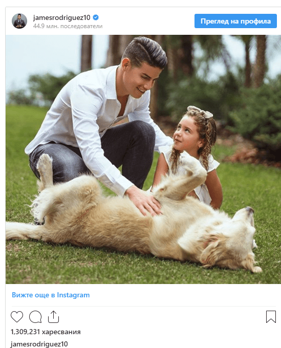 Джеймс Родригес пък, съотборника на Марсело, показва снимка заедно с дъщеря и чудесния ретривър на име Дилън .