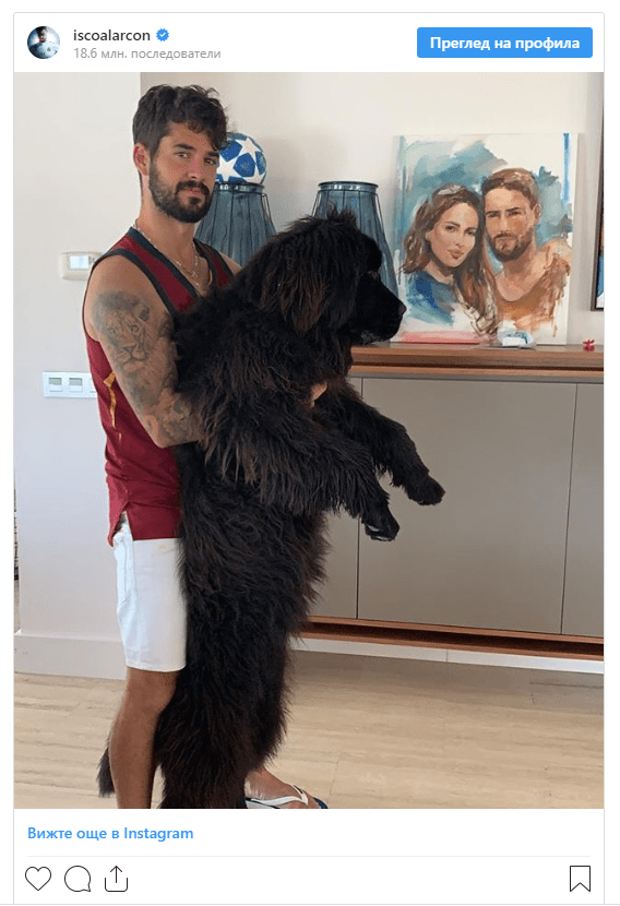 Полузащитникът на Реал Иско е собственикът на огромен домашен любимец. Само малко недостига, за да се изравнят по ръст. За сметка на това кучето компенсира с доста по-буйната си грива. Това не е единственото куче на Иско. Той си има цял отбор от четири хубавци, а единият от тях се казва Меси.