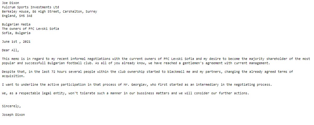 Това писмо е свързано с последните ми неформални преговори с настоящите собственици на ПФК Левски София и желанието ми да стана мажоритарен акционер в най-популярния и успешен български футболен клуб. Както всички вече знаете, ние постигнахме джентълменско споразумение с настоящото ръководство.