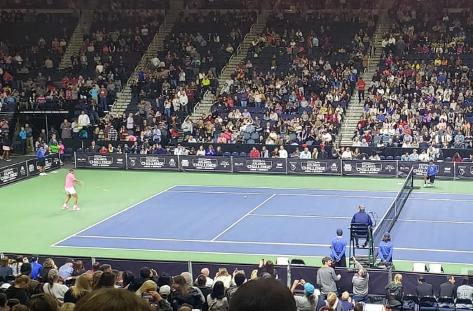 Арената с капацитет 13,100 седящи места бе препълнена, като привържениците показваха подкрепата си към Надал и Димитров през целия мач.