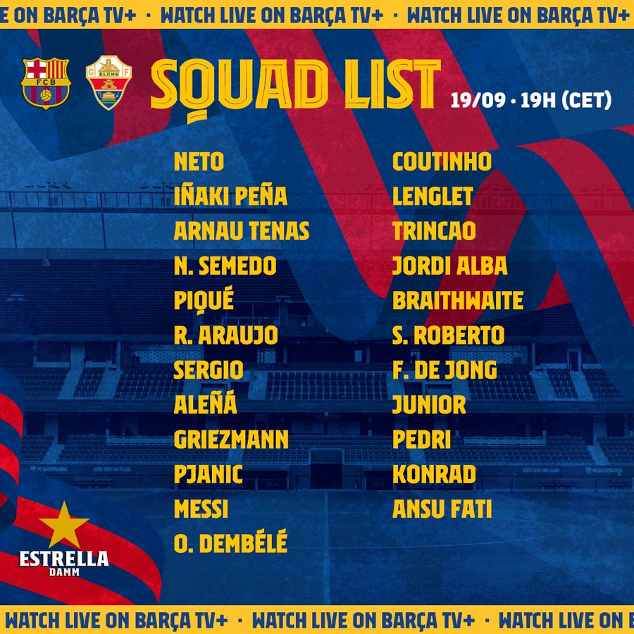 В групата на Барса се завръща възстановилият се след контузия Ансу Фати, който лекуваше контузия, а за първи път в състава е и новото попълнение Миралем Пянич.