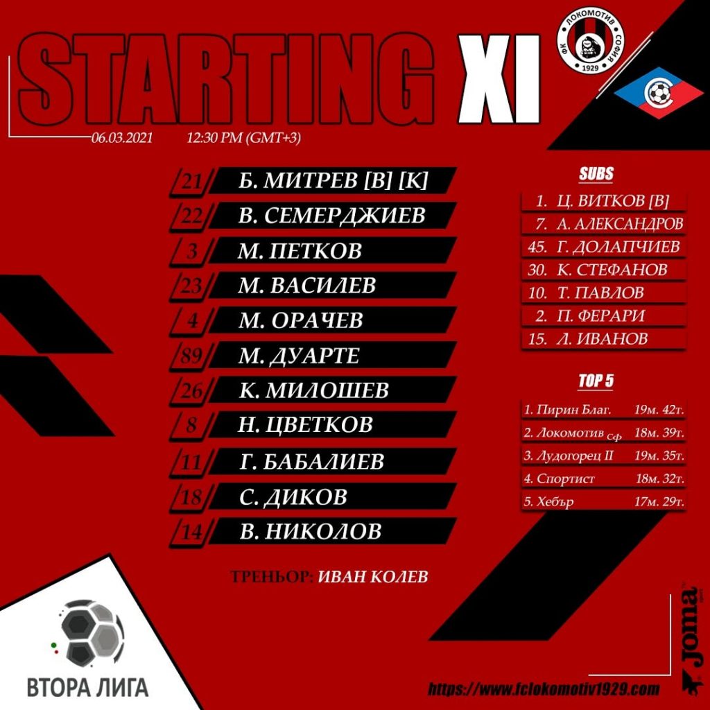 При успех “железничарите” отново ще оглавят временното класиране във втория ешелон. В момента начело е Пирин, който вчера завърши наравно – 0:0, при гостуването на Созопол, с 42 точки. Локо е втори с 39, но и с мач по-малко.
