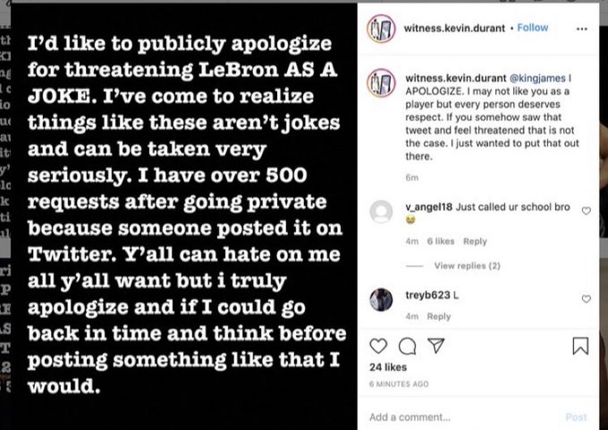 “Бих искал да се извиня публично за заплахата срещу ЛеБрон, която беше шега,” написа съюият потребител. “Разбрах, че това не е много смешно и може да се приеме много сериозно.