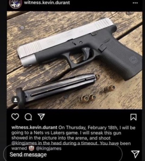 “В четвъртък, 18 февруари, ще присъствам на мача Бруклин – Лейкърс,” пише потребителят evidence.kevin.durant. “Ще вмъкна пистолета, показан на снимката, в залата и ще застрелям ЛеБрон Джеймс в главата по време на прекъсване. Предупреден си, ЛеБрон.”