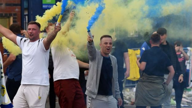 Десетки жълти и сини димки се понесоха в небето над Лийдс, а хиляди пеещи фенове изпълниха улиците. Голяма част от се събраха пред статуята на легендарния полузащитник на тима Били Бремнър.