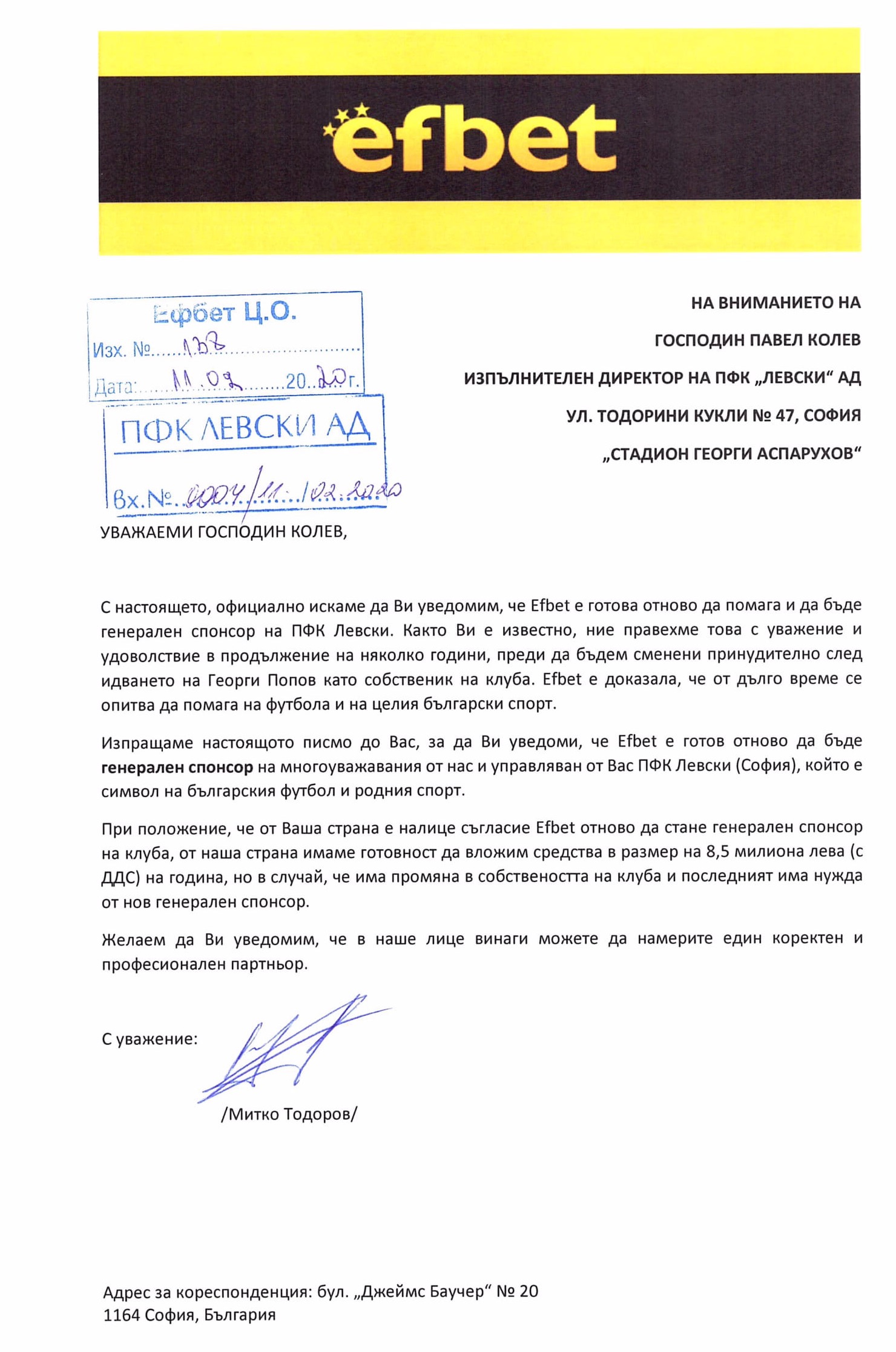 “На 11.02.2020 г. в деловодството на „ПФК Левски“ беше получено писмо от хазартния оператор Efbet, с което се предлага финансова помощ с условие за прехвърляне на собствеността на отбора. В писмото не е посочено на кого следва да бъде прехвърлена собствеността, но е посочена сума под формата на спонсорство при евентуално изпълнение на условието.