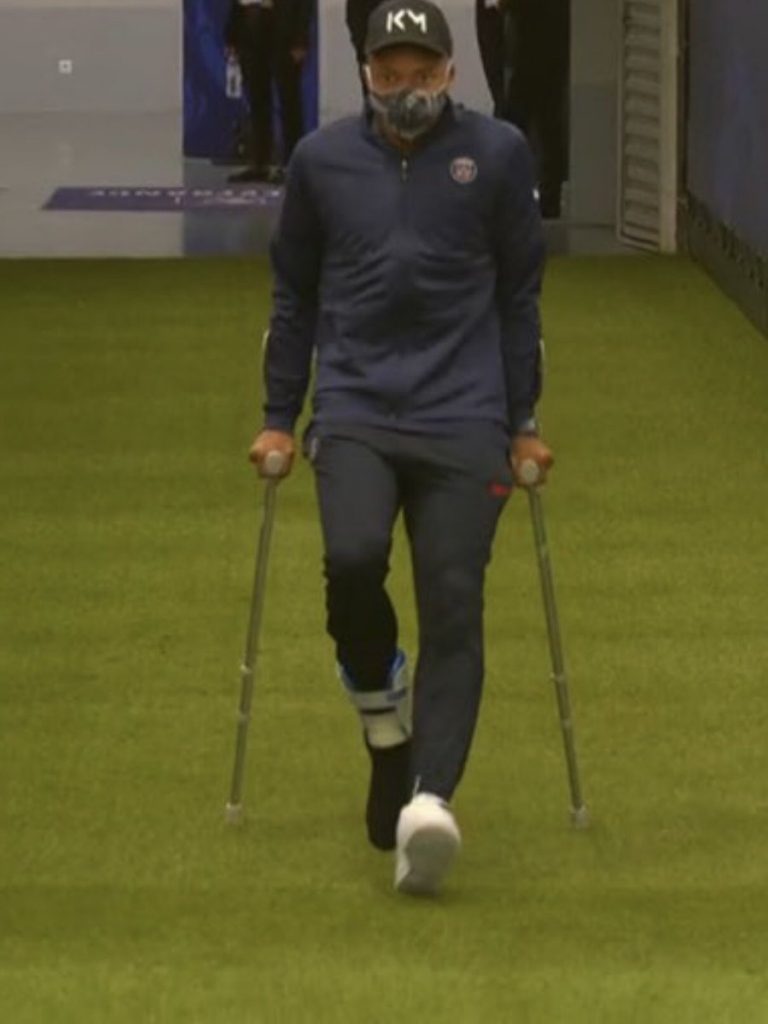 Десетина минути преди края на двубоя Мбапе се завърна на стадиона на патерици и с обездвижен глезен.