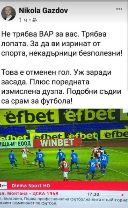 “Не трябва ВАР за вас!” изригна Газдов във Фейсбук. “Трябва лопата. За да ви изринат от спорта, некадърници безполезни! Това е отменен гол. Уж заради засада. Плюс поредната измислена дузпа. Подобни съдии са срам за футбола!.”
