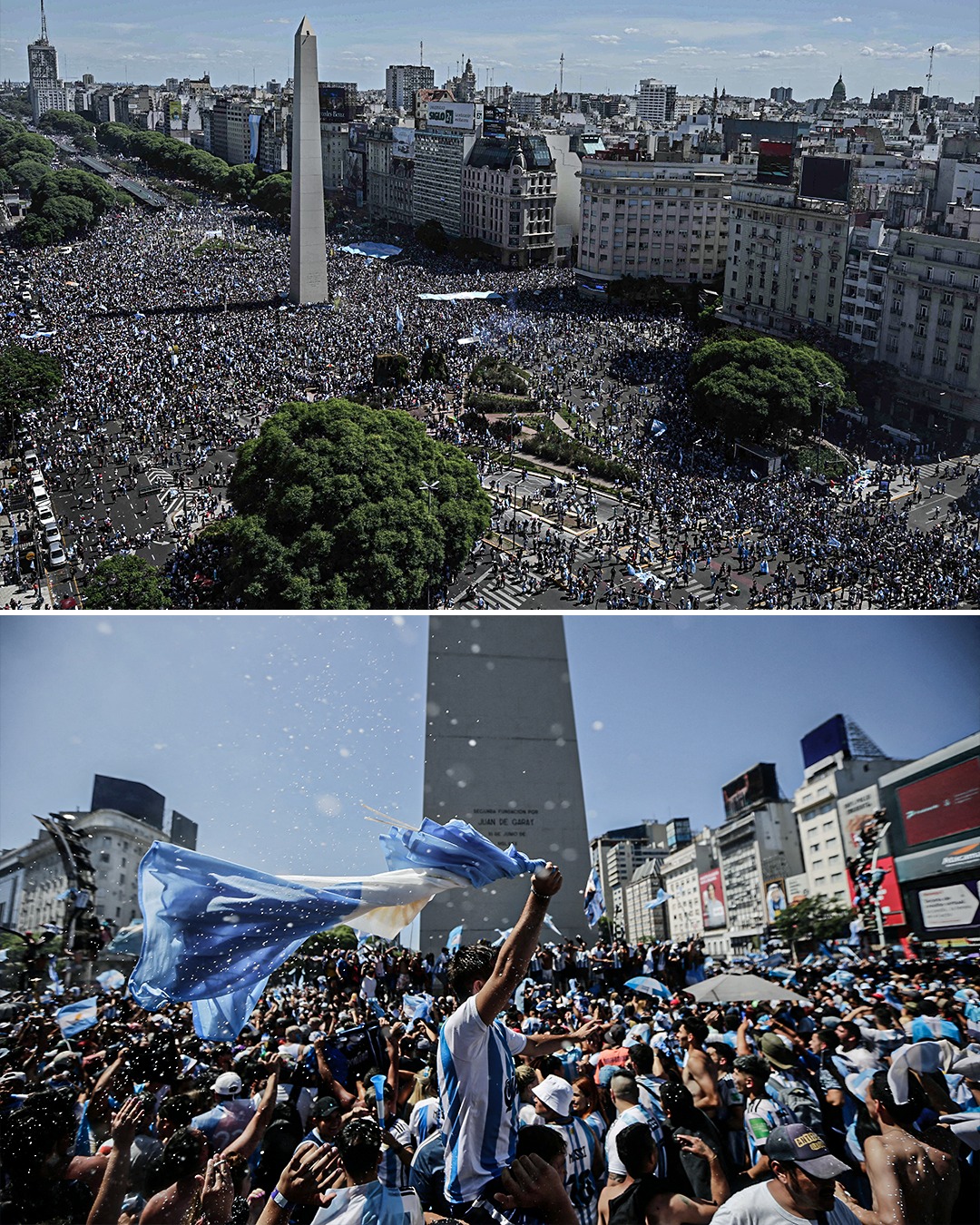 Аржентина спечели световната титла след триумф над Франция след изпълнения на дузпи. Световната купа се завръща в Аржентина след 36 години, а мечтата на Лионел Меси се превърна в реалност. В столицата Буенос Айрес стотици хиляди излязоха по улиците, за да празнуват победата. Ето и няколко снимки от улиците на аржентинската столица в момента: