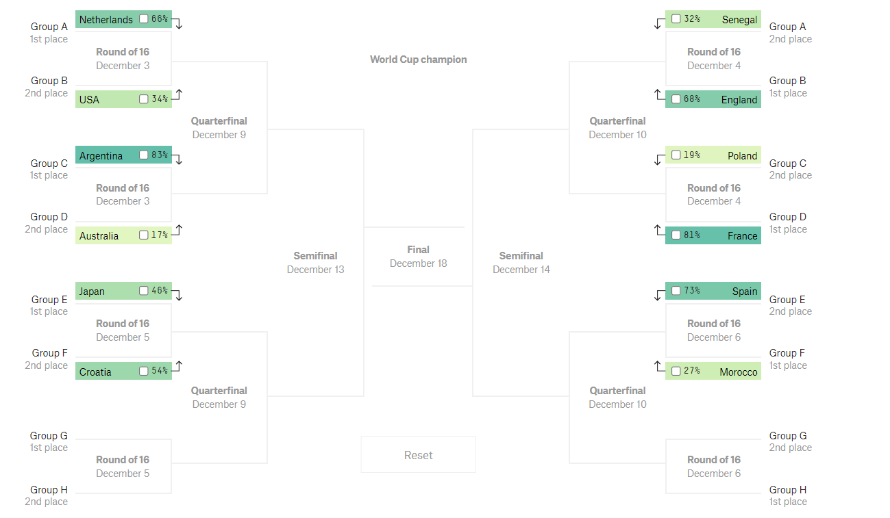Според компанията за футболни статистика “FiveThirtyEight” преди изиграването на мачовете от група “Е” и евентуално класиране на Испания като първи в групата, шансовете им за победа над Хърватия бяха 60%, докато сега те са 73% срещу Мароко.