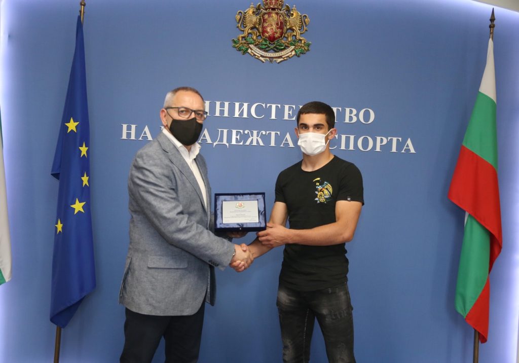 Служебният министър на младежта и спорта Андрей Кузманов награди с почетен плакет Рухан Расим за бронзовия медал, който той спечели в категория до 61 килограма в свободния стил на европейското първенство (до 23 години) в Скопие, Македония.