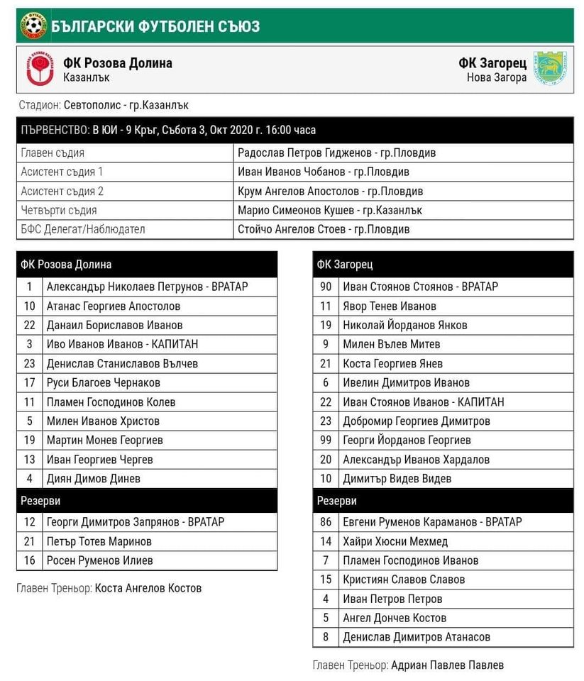 Наставникът на Загорец Миро Миндев отново може да разчита на опитния халф Коста Янев, а в стартовата единайсеторка намират място също Милен Митев, Георги Йорданов – Панела и Добромир Димитров.